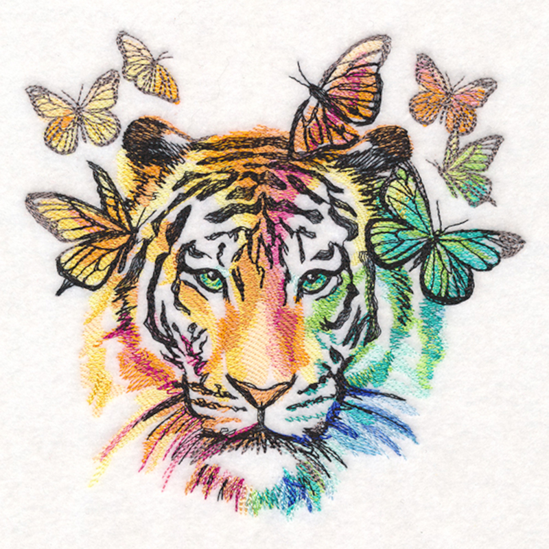 Un arc-en-ciel de papillons donnent à de ce tigre Sauvage une toute autre attitude…